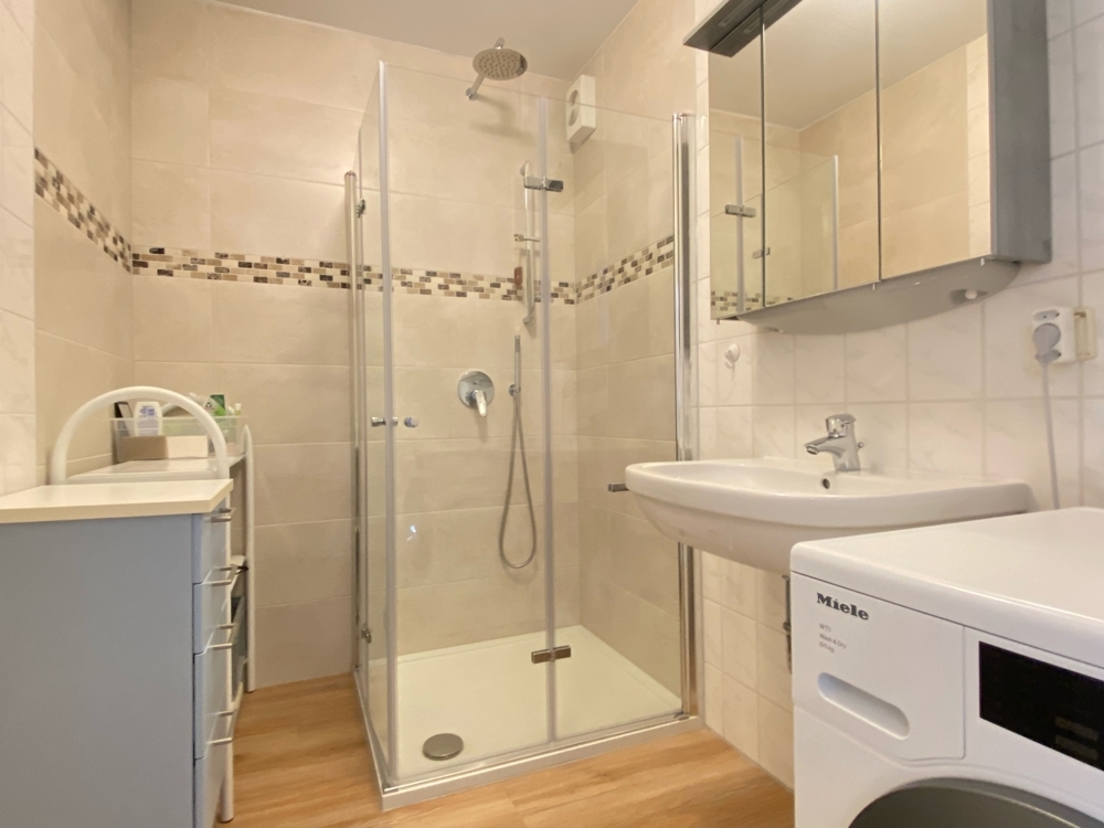 Die Wohnung überzeugt durch eine zeitgemäße, moderne und gepflegte Ausstattung: - Doppelt verglaste Fenster mit Rollläden - Moderner Vinylboden in den Wohnräumen - Einbauküche - Badezimmer mit Dusche und Waschmaschinenanschluss (ohne WC) - Separates Gäste-WC - Balkon in Richtung Süden - Zwei Tiefgaragenstellplätze Umfassende Renovierung im Jahr 2022: - Erneuerung der Bodenbeläge - Wände mit Malervlies versehen und neu gestrichen - Teilmodernisierung des Badezimmers - Aufbereitung und Neuanstrich der Türen und Zargen